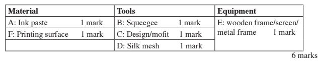 (f)Block printing / Relief printing (wood block/linoleum). 1 mark