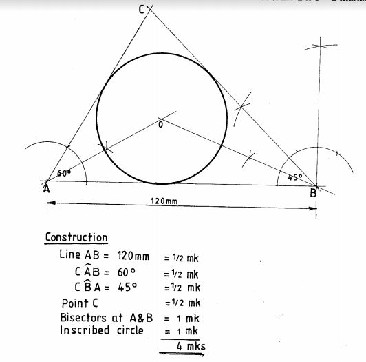 10 Using a pair of compasses and a ruler only. construct a triangle whose base length AB = 120 mm. angle CAB = 60“ and angle ABC = 45“ hence inscribe a circle touching all the sides. (4 marks)