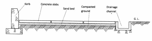 (b) Using a sketch, explain how to construct a public footpath using concrete slabs. (4 marks)