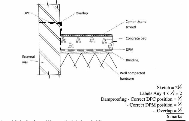 13 (a) With the aid of a labelled sketch, show the damp proofing details at a junction of a floor slab and an external wall. (6 marks)
