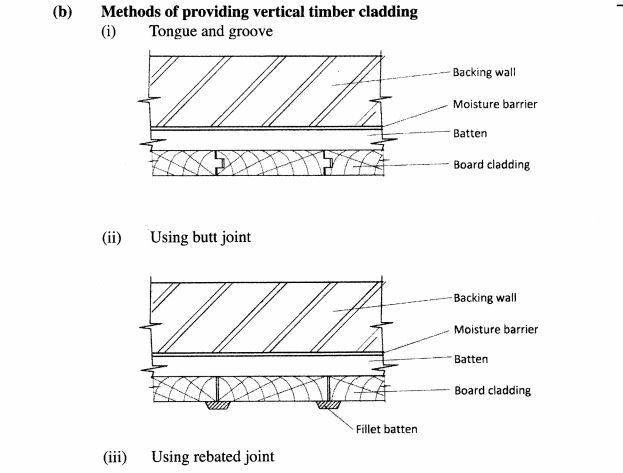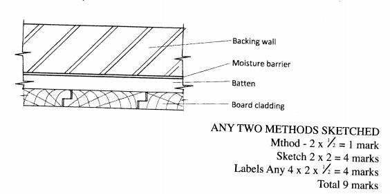 (b) Sketch and label horizontal sections to show two methods of fixing a vertical timber cladding on a wall. (9 marks)