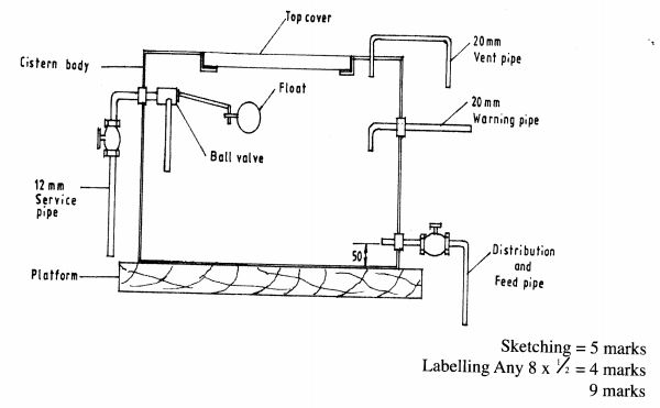 14 (a) Sketch and label a vertical section through a cold water storage cistern. (9 marks)