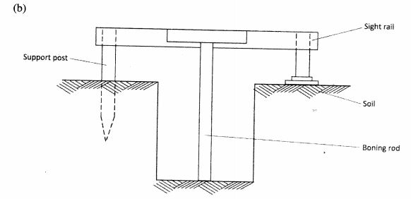 (b) With the aid of a labelled sketch, explain how a boning rod and a site rail are used to level a trench bottom. (6 marks)