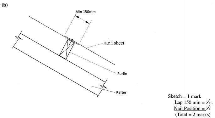(b) Sketch a section of a roof to show the minimum lap of iron sheets at a purlin. (2 marks)