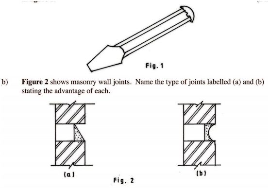 (b) Figure 2 shows masonry wall joints. Name the type of joints labelled (a) and (b)