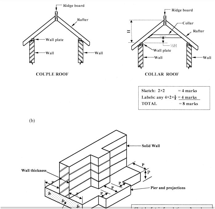 14 (a) Use labelled sketches to show the difference between a couple roof and a collar roof.