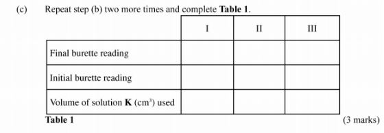 (i) average volume of solution K used; (1 mark)