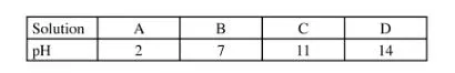 12 The table below shows the pH values of solutions A, B, C and D.