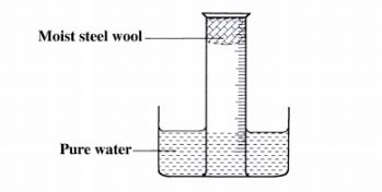 16 A measuring cylinder fitted with moist steel wool was inverted in a trough of water as shown in
