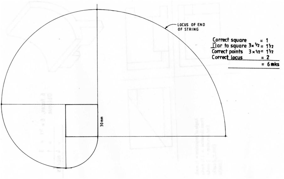 Draw the locus of the end of a string when it is unwound from a 30 mm square prism for one