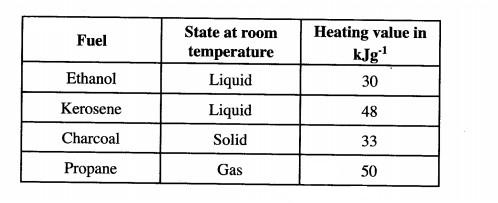 (b) The table below shows heating values of some fuels. Use it to answer the questions that follow