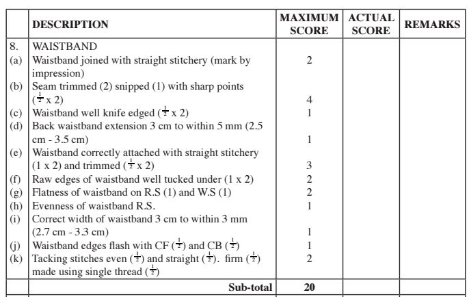 (f) Attaching of the front and back waistbands and holding them in place using tacking stitches.(21 marks)
