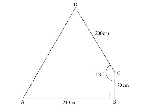 AB = 240m, BC = 70 m, CD = 200m, LBCD = 150° and LABC I 90°.