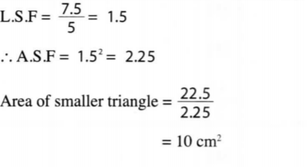 15. The corresponding lengths of two similar triangles are 5 cm and 7.5 cm. If the area of the larger triangle is 22.5 cm2, calculate the area of the smaller triangle. (3 marks)