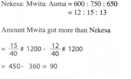 4. Tito owned Ksh 600 to Nekesa, Ksh 750 to Mwita and Ksh 650 to A uma. He had Ksh 1200 to repay to the three people in proportion to what he owed them. Calculate the amount of money Mwita rcceived more than Nekesa. (3 marks)