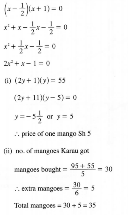(b) (i) Barasa bought (2y + l ) mangoes at y shillings each. The total cost of the mangoes was Ksh 55. Find the cost of each mango. (4 marks)