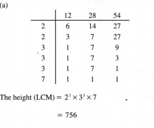 13. Three types of books A, B and C were each piled on a table to attain the same height. The thickness of the books were 12 mm, 28 mm and 54 mm for types A, B and C respectively. Find: