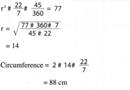 16. The area of a sector of a circle is 77 cm2'. The arc of the sector subtends an angle of 45° at the centre of the circle. Find the circumference of the circle. (Take ℿ=22/7 (4 marks)