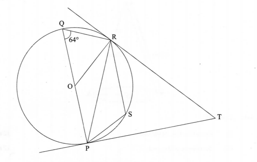 + RTP = 180 - 2 ^64 h= 52° + TRP = 64° angle in alternate segment and sum of angles in triangle PRT = 180°.