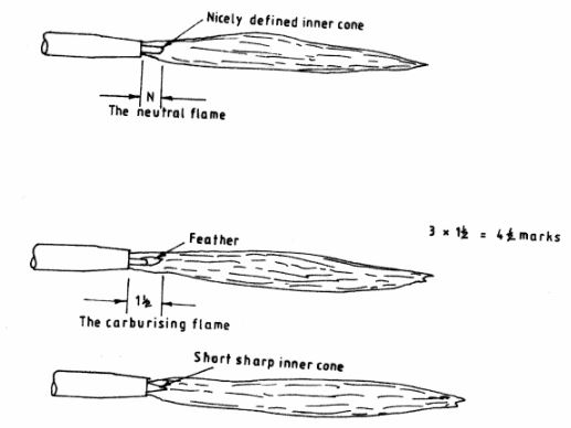 (b) (i) Use labelled sketches to show the three types of gas welding flames.