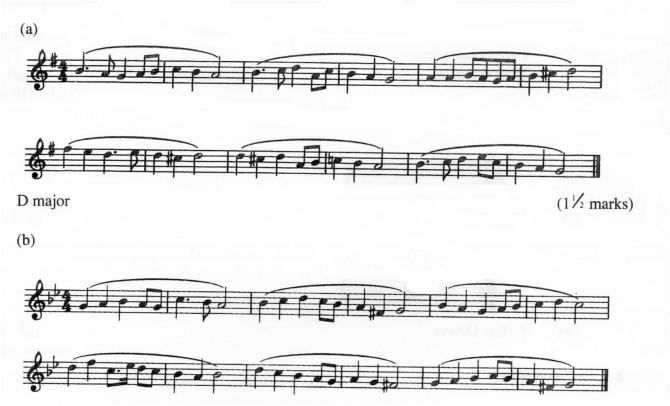 1. Either (a) Continue the following opening to make a melody of sixteen bars for voice introducing modulation to the subdominant and then back to the tonic. Incorporate dotted rhythm and add phrase marks. (12 marks)