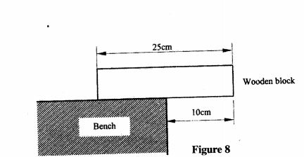 Figure 8 shows a uniform wooden block of mass 2kg and length 25cm lying on a bench. It hangs over the edge of the bench by 10cm. Use the figure to answer questions 11 and 12.