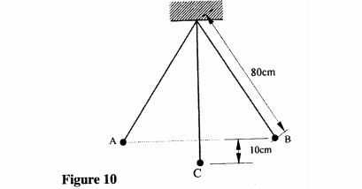 15 Figure 10 shows a simple pendulum of length 80cm. The pendulum bob whose mass is 50g oscillates between points A and B, through its rest position C. A and B are both 10cm higher than C.