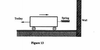 (c) Figure 13 shows a friction less trolley of mass 2kg moving With uniform velocity towards a wall. At the front of the trolley is a spring whose spring constant is 25N/m . The trolley comes to rest momentarily after compressing the spring by 3cm and then rebounds from the wall.
