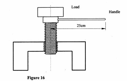 (b) Figure 16 shows a screw jack whose screw has a pitch of 1mm, and has a handle of 25 cm long.