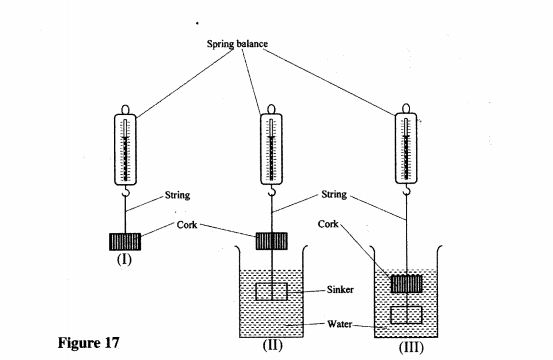 (c) Figure 17 shows three stages of an experiment to determine relative density of cork which normally floats on water. To make it sink, a sinker is hung below the cork.