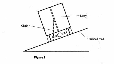 1 Figure 1 shows a lorry moving on an inclined section of a straight road. At the back is a chain hanging from a point on a horizontal axis through the cenne of gravity of the lorry.