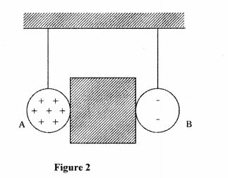 2 Figure 2, shows two identical pithballs A and B suspended with insulated threads. They z separated by an insulator X. A is positively charged while B is negatively charged. The quantity of charge on A is three times the quantity of charge on B.