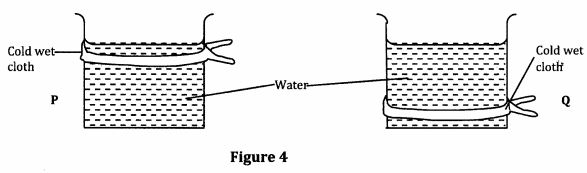 5 Figure 4 shows two identical beakers P and Q full of water at 90°C. Two similar cold wet clothes are wrapped, one around the top of P and the other around the bottom of Q.