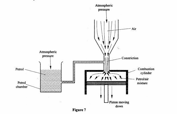 9 Figure 7 shows part of a petrol engine, in which air flowing under atmospheric pressure passes into a constriction, where it mixes with petrol. The mixture then flows into a combustion cylinder.