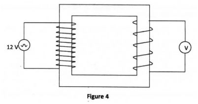 8 Figure 4 shows a simple transformer connected to a 12 V a.c. source and an a.c. voltmeter.