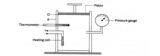 (a) While the piston is at position O, the pressure of the enclosed gas is 10 Ncm-2 at a temperature of 27°C. When a 10 kg mass is placed on the piston, it comes to rest at position A without change in the temperature of the gas.