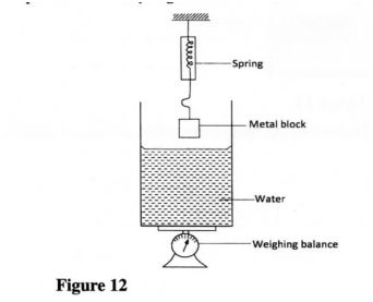 18 (a) Figure 12 shows a weighing balance on which a beaker containing some water is placed. The reading on the balance is 2.80 N. A metal block weighing 2.7 N is suspended from a spring balance.