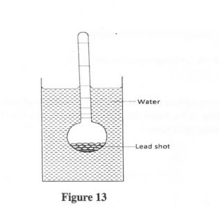 (c) Figure 13 shows a hydrometer with a thin stem floating in water in a beaker.