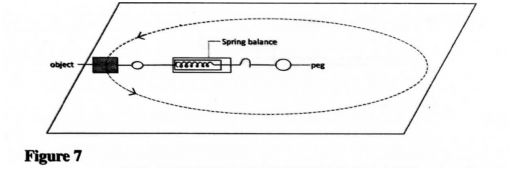 (b) Figure 7 shows an object at the end of a light spring balance connected to a peg using a string. The object is moving in a circular path on a smooth horizontal table with a constant speed.