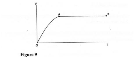(b) Figure 9 shows a graph of velocity against time for a ball bearing released at the surface of viscous liquid.