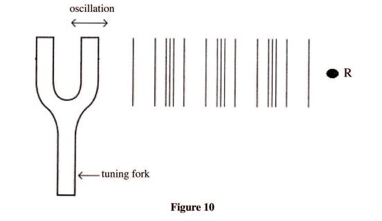 (b) Figure 10 shows sound waves in air produced by a vibrating tuning fork. R is an air molecule on the path of the waves.