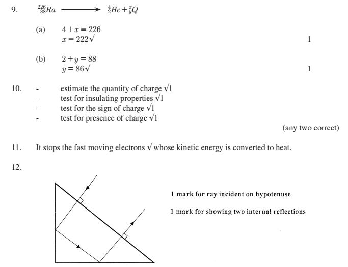 12. Draw a ray diagram to show how a ray of light may be totally internally reflected two times in an isosceles right - angled glass prism. (Assume that the critical angle of glass is 42”) (2 marks)