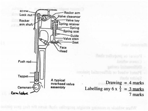 As the valve opens, gases are allowed to either enter or exit the cylinder. Further rotation of the camshaft makes the cam to release pressure on the tappet and so both the tappet and the push rod and the valve are retumed to normal p0sition®by the pressure of the released valve spring. (8 marks)