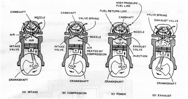 14 With the aid of labelled diagrams, explain the operation of a four-stroke compression ignition system. (15 marks)