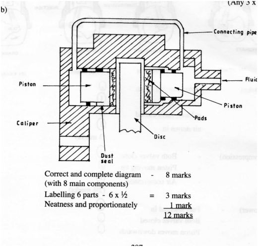 (b) Sketch a sectional diagram of a disc brake assembly and label six parts. (12 marks