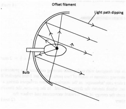 10. Sketch a dipped beam light path having an offset filament and label its parts. (3 marks)