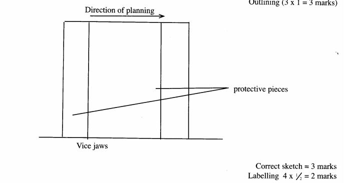 (c) With the aid of a labelled sketch, outline the procedure of planing the end grains of a work niece measuring 75mm wide. (8 marks)