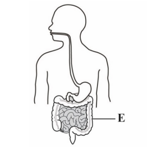 2. The diagram represents some parts of the human digestive system. Which one of the following is the main function of the part labeled E in digestion?