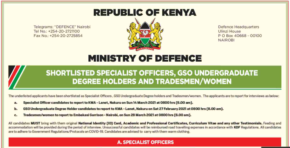 Kenya Defence Forces Shortlisted Candidates 2025 ↗️ KDF Shortlisted Candidates 2025 ↗️ List of New KDF Recruits 2025 - Cadets, Specialist Officers, Tradesmen/Women 2025 - Kenya Defence Forces Recruitment Shortlist 2025 - Click Here!