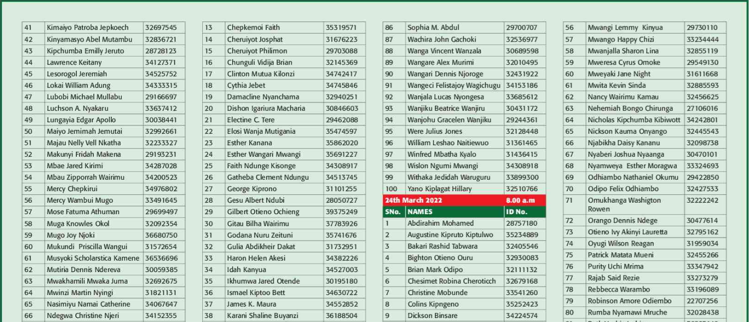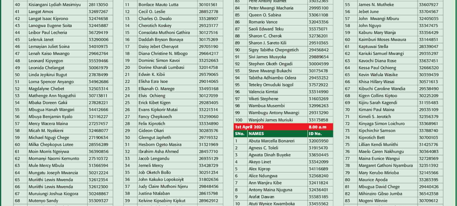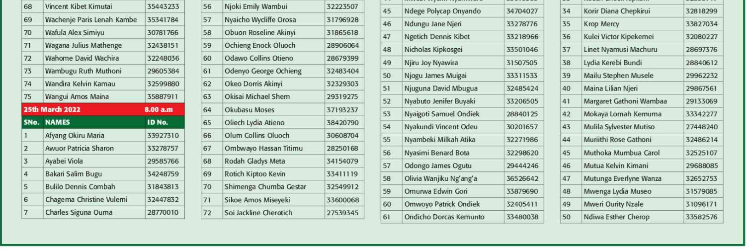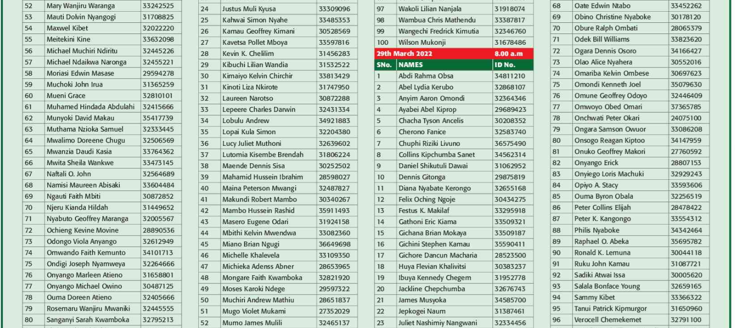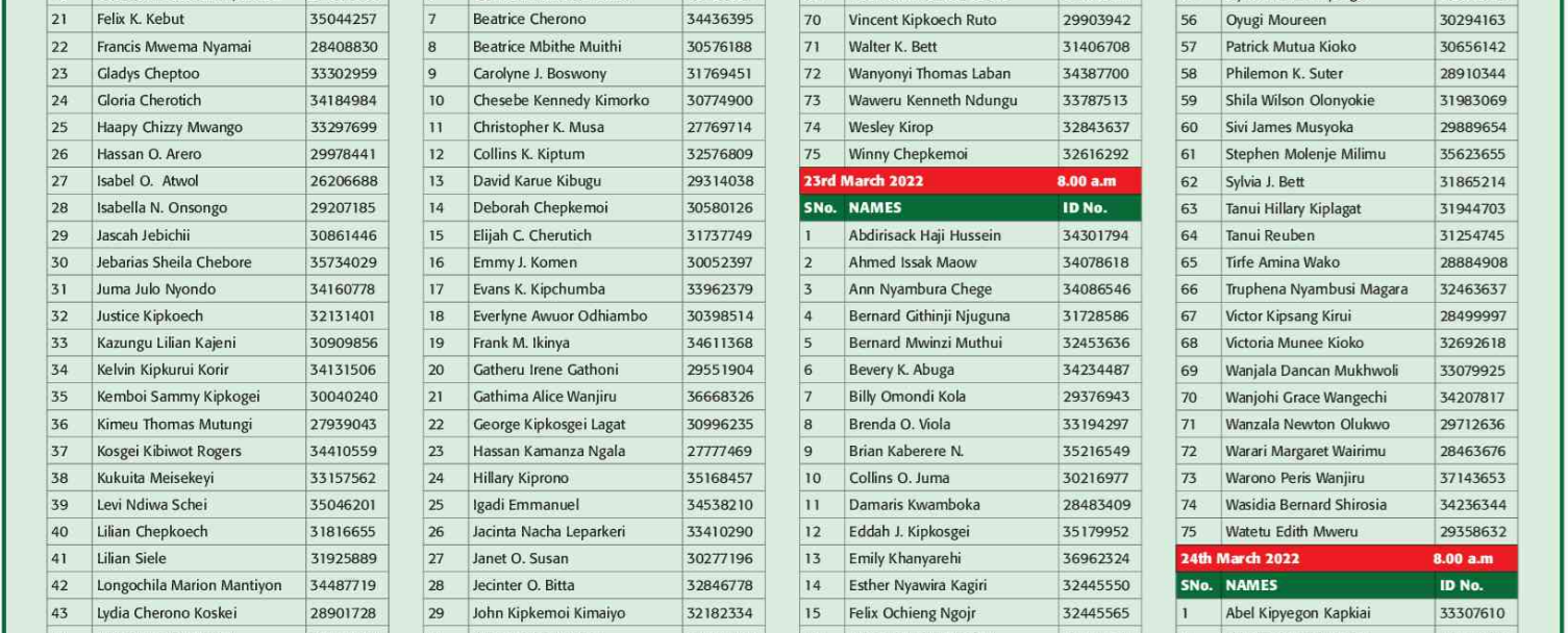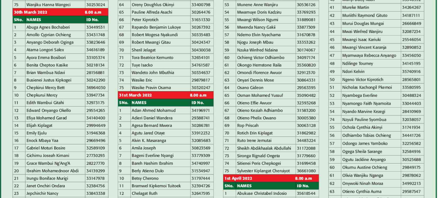 Prospective candidates must carry their original identification card, birth certificate, KRA PIN certificate, academic certificates and other testimonials on the day of recruitment.